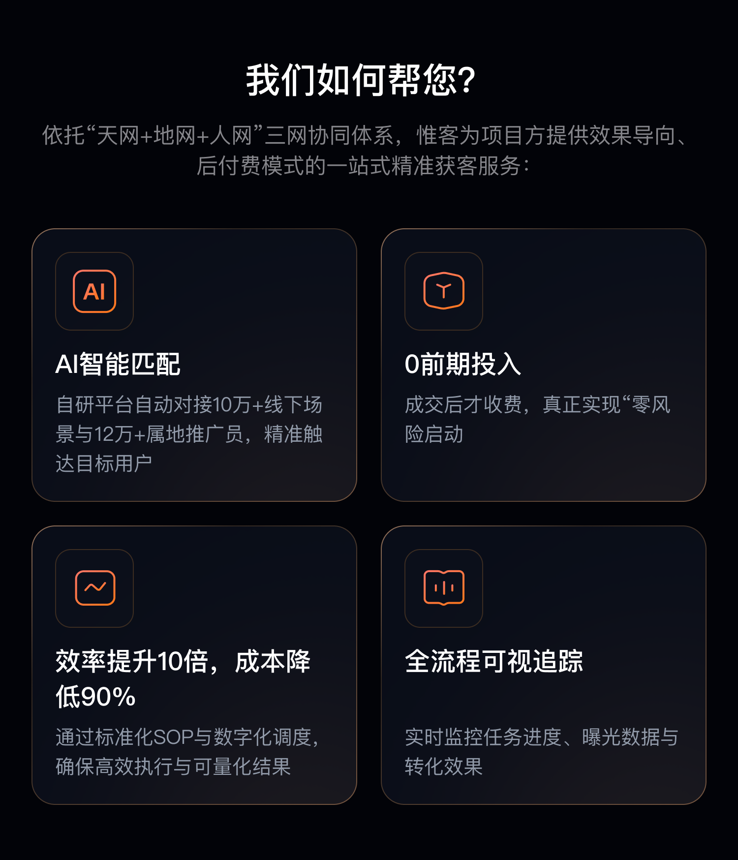 依托“天网+地网+人网”三网协同体系,惟客为项目方提供效果导向、后付费模式的一站式精准获客服务: