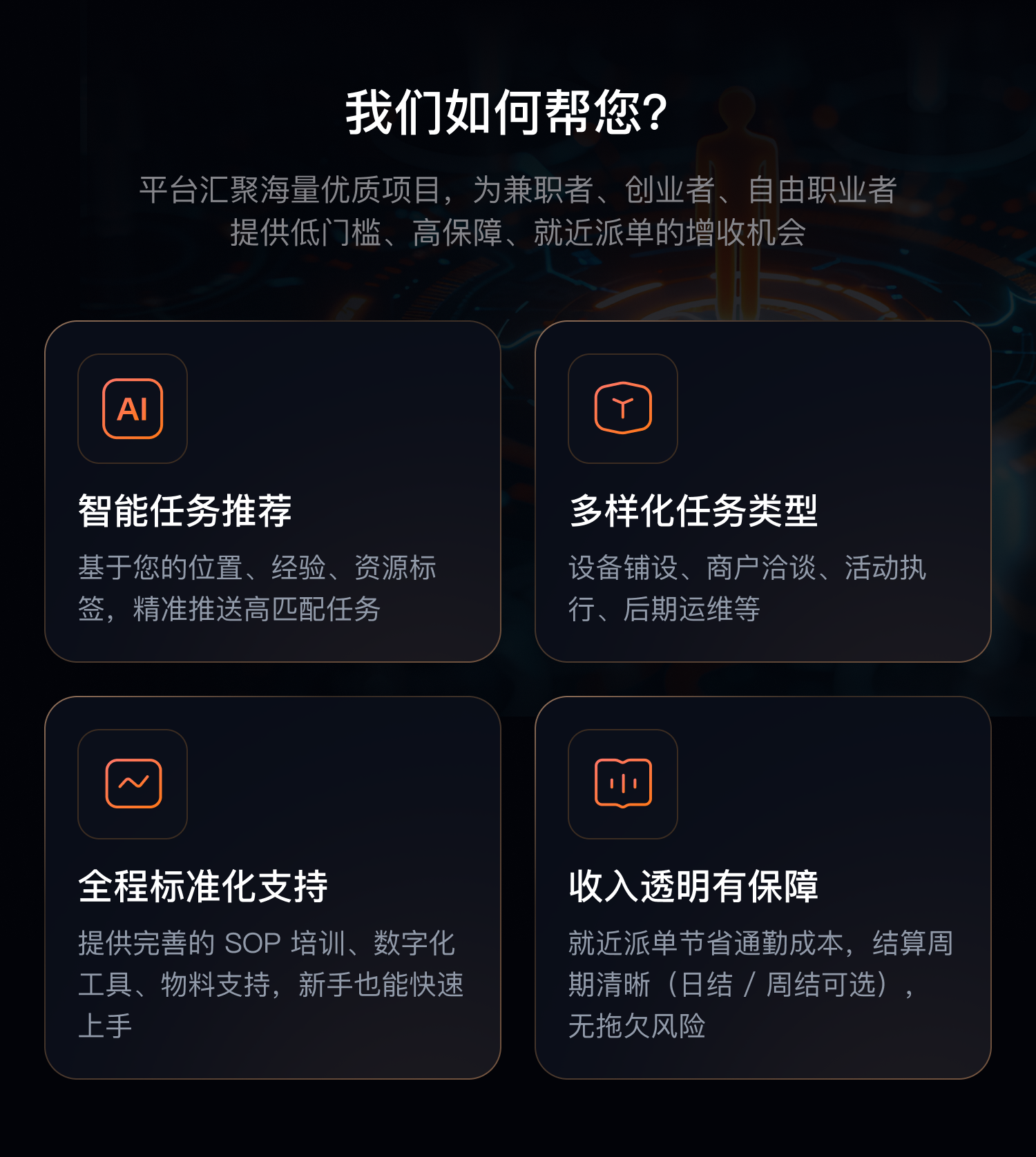 平台汇聚海量优质项目,为兼职者、创业者、自由职业者提供低门槛、高保障、就近派单的增收机会